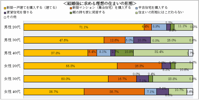 結婚後の理想の住まいを聞いてみると、男性は20代で新築一戸建て志向がかなり強く表れていますが、年齢が上がるにつれて、多様性がみられる傾向に。一方女性は20代では持ち家志向ですが、男性より新築マンションの割合が高く、より現実的な考え方であることが読み取れます。30代になり、一時的に持ち家志向が下がりますが、40代になると、再び上昇。40代は、他の年代よりも<恋人に求める住まいの形態>と、<結婚後の理想の住まい>で、“持ち家”が支持され、その本音は「早く持ち家の恋人と落ち着きたい」というところなのかもしれません。 | ||||||||||||||||||||||||||||||||||||||||||||||||||||||||||||||||||||||||||||||||||||||||
